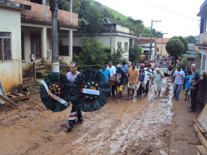 Cortejo acompanha o enterro de vítimas do deslizamento de terra. Até as 14h haviam 11 pessoas desaparecidas, mas o secretário estadual de Defesa Civil, coronel Sérgio Simões, disse que é muito improvável encontrar algum sobrevivente.